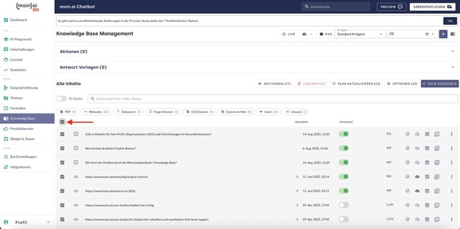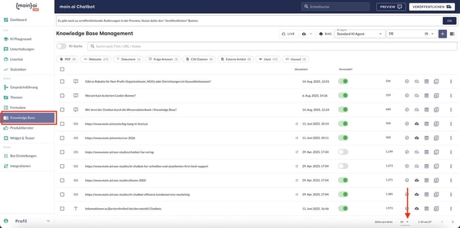 1. Alle Ressourcen auswählen:- Im Menü Knowledge Base wird unten rechts “Zeilen pro Seite: alle" eingestellt.